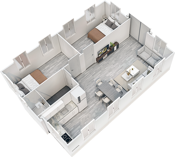 The floor plans of our Premium Tiny Homes offer a comfortable and relaxed living experience while maximising the use of space and natural light. We have 4 unique floor plan options with 1, 2, 3, and 4 bedrooms, living space, kitchenette, and bathroom with shower + toilet.